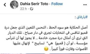 وكان ضحية توتو قد علق على خسارة الصحفية درة قمبو منصب نقيب الصحفيين بقوله: يارفاق: أصل الحكاية هو سوء الحظ، النحس اللعين الذي جعل درة قمبو تنافس في انتخابات تجري في دار صباح، تلك الديار التي تري أن أمثال درة مجرد خادمة .. لا يجوز لها أن تترأس مؤسسة، لو أن ( قمبو) هي” تسابيح ” لإنهال عليها الأصوات وفازت فوزاً كبيراً