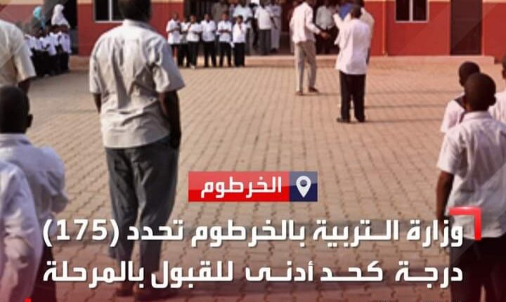 حددت الإدارة العامة للمرحلة الثانوية بوزارة التربية والتعليم بولاية الخرطوم، (175) درجة كحد أدنى للقبول بالمدارس الثانوية .