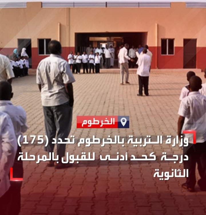 حددت الإدارة العامة للمرحلة الثانوية بوزارة التربية والتعليم بولاية الخرطوم، (175) درجة كحد أدنى للقبول بالمدارس الثانوية الجغرافية؛ والتوزيع لأقرب مدرسة من السكن.