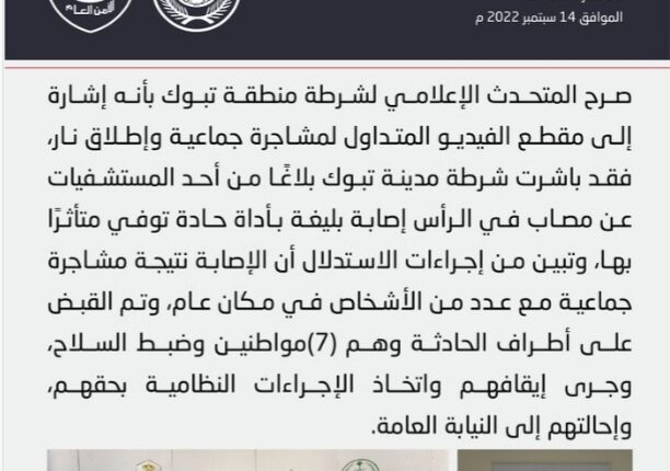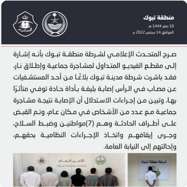 وقال المتحدث باسم شرطة منطقة تبوك في بيان إنه ” إشارة إلى فيديو متداول لمشاجرة جماعية وإطلاق نار، فقد باشرت شرطة مدينة تبوك بلاغا من أحد المستشفيات عن مصاب في الرأس إصابة بليغة بأداة حادة توفي متأثرًا بها”.