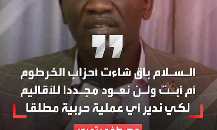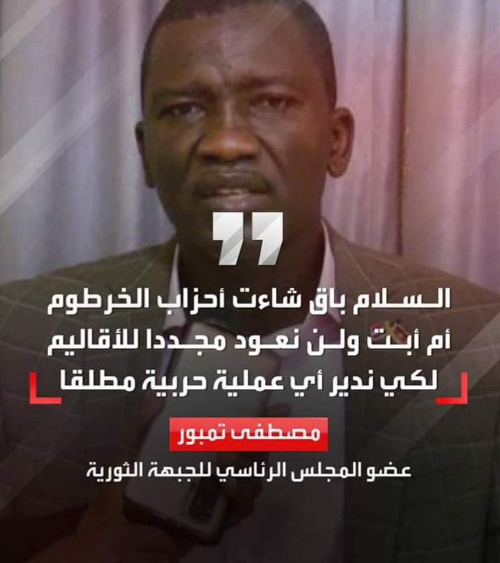 أعلنت الجبهة الثورية السودانية، رفضها القاطع لدعوات إلغاء اتفاق جوبا للسلام. وقال عضو المجلس الرئاسي بالجبهة مصطفى تمبور لـ”سودان تربيون”: إن السلام باق شاءت أحزاب الخرطوم أم أبت، ولن نعود مجدداً للأقاليم لكي ندير أي عملية حربية مطلقاً.