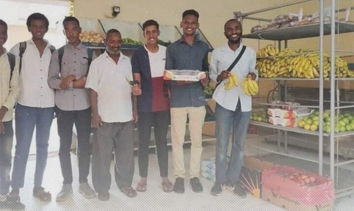 أستاذ الفيزياء بكلية العلوم جامعة الخرطوم محمد يوسف يفتتح محلاً تجارياً لبيع الخضر والفاكهة بمحيط مبنى الجامعة.