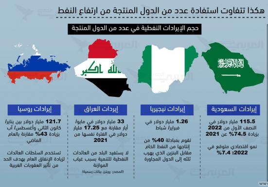 زادت عائدات العراق، التي تعتمد بشكل أساسي على مبيعات النفط، بشكل كبير من ارتفاع أسعار النفط بعد حرب أوكرانيا لتجني عائدات قيمتها 33 مليار دولار في مارس/ آذار وأبريل/ نيسان ومايو/ أيار 2022 مقارنة مع 17.25 مليار دولار فقط في نفس الفترة من عام 2021، وذلك وفقاً للبيانات الرسمية الصادرة عن وزارة النفط.