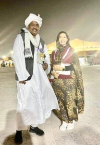 المصادفة وحدها كانت حاضرة وفي مدخل الاعلاميين وجدت زميلي عوض الجيد الكباشي وهو الاخر يرتدي اللبس السوداني ( جلابية وعمه وسديري) فكان السودان 🇸🇩 حاضرًا في اهم حدث عالمي