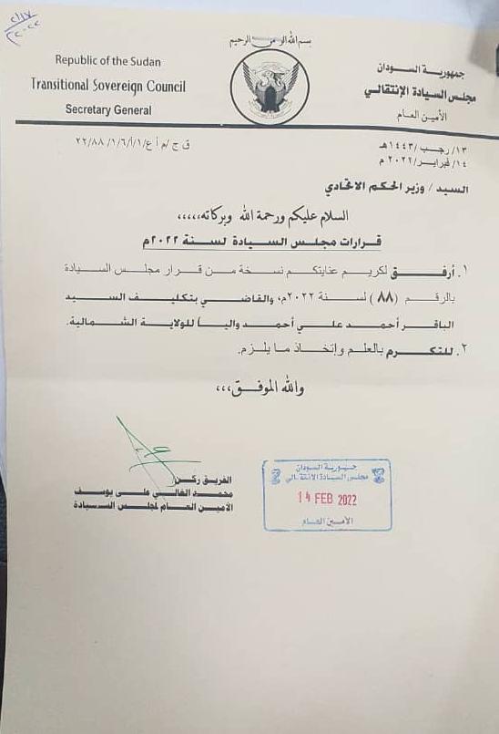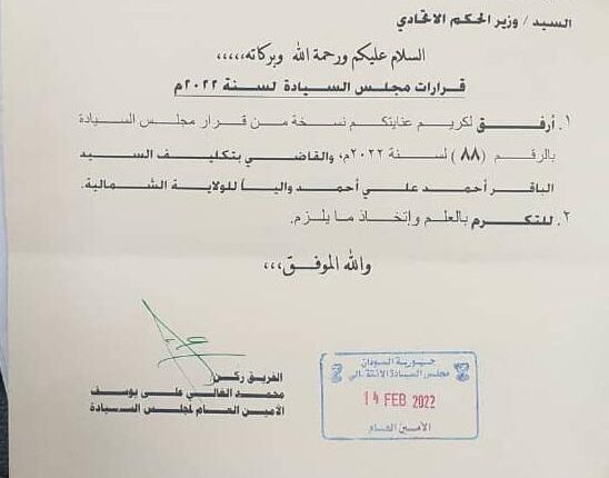 هاش سودان-الخرطوم _ أصدر السيد رئيس مجلس السيادة الفريق أول ركن عبدالفتاح البرهان قرارًا بتكليف السيد الباقر احمد علي أحمد واليا للولاية الشمالية