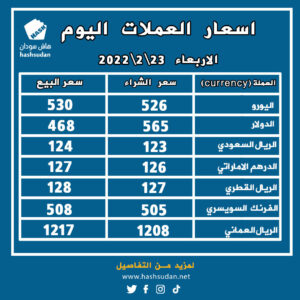 أسعار العملات اليوم الأربعاء 23/2/2022 الإقتصاد في فبراير 23, 2022 شارك هاش سودن/ الخرطوم – أسعار العملات اليوم الأربعاء 23/2/2022 شارك FacebookTwitterGoogle+ReddItWhatsAppPinterestالبريد الإلكتروني
