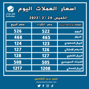 أسعار العملات اليوم الخميس 2022/2/24م الإقتصادمواضيع بارزة في فبراير 24, 2022 شارك هاش سودان/ الخرطوم – أسعار العملات اليوم الخميس 2022/2/24م شارك FacebookTwitterGoogle+ReddItWhatsAppPinterestالبريد الإلكتروني