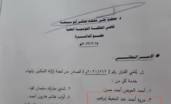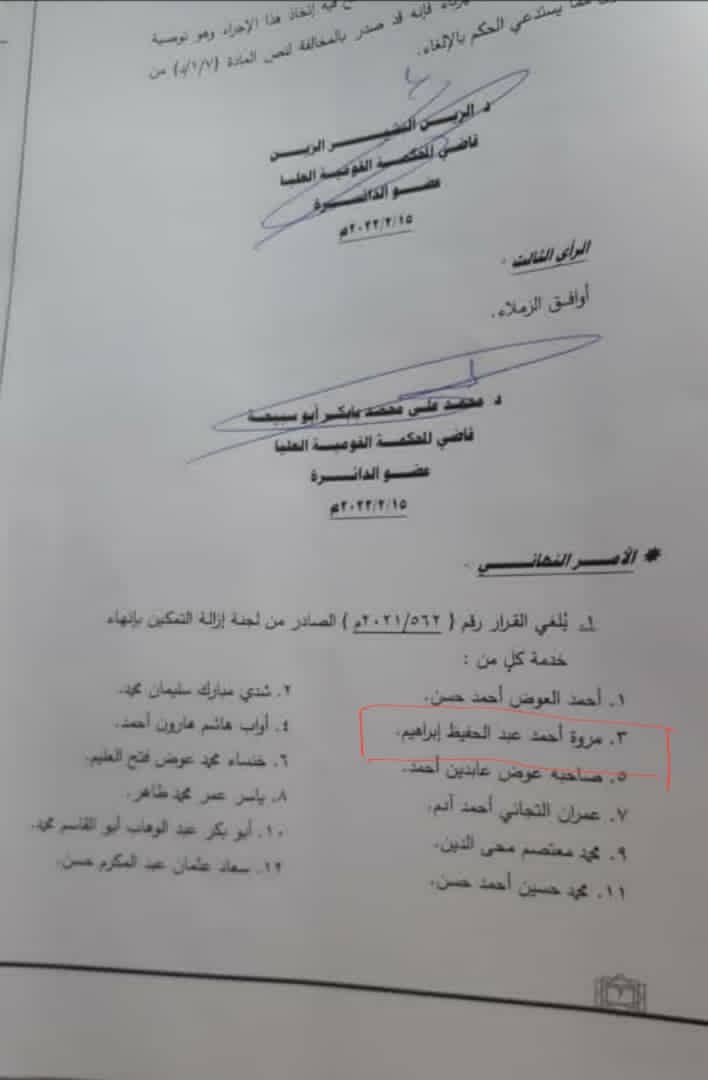 هاش سودان-الخرطوم _ المرحومة مروة احمد عبدالحفيظ المخطط الاستراتيجي بالمجلس الاعلى للاستراتيجية والمعلومات بولاية الخرطوم تعيدها المحكمة القومية العليا للخدمة بعد ان صعدت روحها الطاهرة الى بارئها لتلاقي المولى عز وجل بمظلمتها ضد لجنة التمكين وعنده لا يظلم احد ..