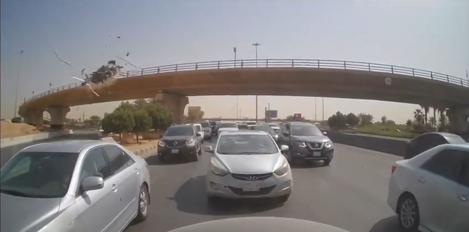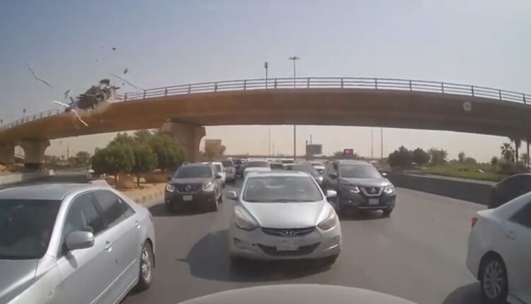 ورصدت عدسة كاميرا مثبتة في سيارة، المركبة تسقط من أعلى كوبري في الرياض بعد اختراقها الحاجز الحديدي، حيث تطاير زجاج السيارة وتناثر على الأرض بعد اصطدامها بالحاجز الحديدي.
