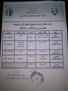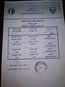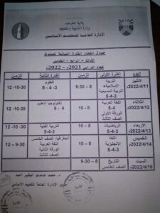 وتعديل تاريخ وزمن امتحان مادة الجغرافيا للصف السادس ليكون في الفترة الثانية يوم الثلاثاء ٢٠٢٢/٤/٢٦م الساعة العاشرة والنصف صباحا بعد امتحان تكنولوجيا الاتصالات.