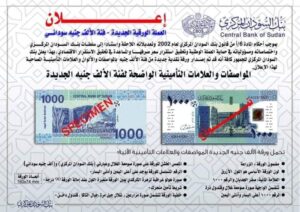 طرح البنك المركزي رسميا الورقة النقدية الجديدة من فئة الألف جنيه للتداول في العاصمة والولايات، ووفقاً لأحكام المادة 6/أ من قانون بنك السودان المركزي للعام 2002، وإستناداً إلى سلطات البنك المركزي واختصاصاته ومسؤولياته في حماية العملة الوطنية وإستقرار سعر صرفها والعمل على تحقيق الاستقرار الاقتصادي.
