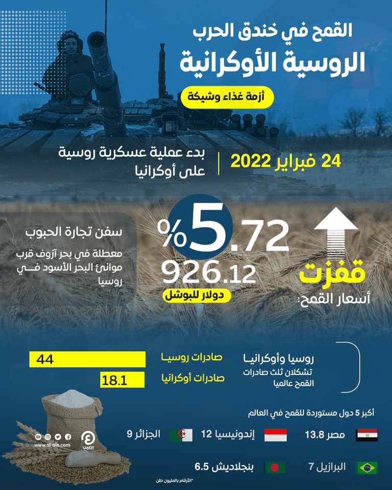 وتواجه إمدادات القمح والحبوب بشكل عام، صعوبات ناتجة عن تبعات الحرب الروسية الأوكرانية، إذ يعد البلدان من أكبر 6 مصدرين للقمح في العالم.