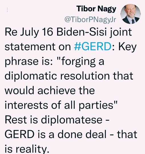 التغريدة تشير الى أن هنالك رعاية خليجية تمت لإثناء إثيوبيا عن موقفها الرافض للتفاوض الثنائي الى إتفاق كامل تم برعاية الجانب الخليجي و تمت مناقشته في اللقاء الثنائي الذي جرى بين بايدن و السيسي في جده