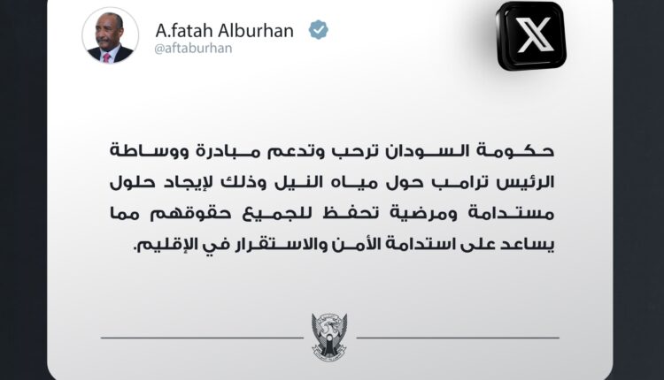 وقال سيادته في تغريدة على حسابه في منصة إكس “حكومة السودان ترحب وتدعم مبادرة ووساطة الرئيس ترامب حول مياه النيل وذلك لإيجاد حلول مستدامة ومرضية تحفظ للجميع حقوقهم مما يساعد على استدامة الأمن والاستقرار في الإقليم
