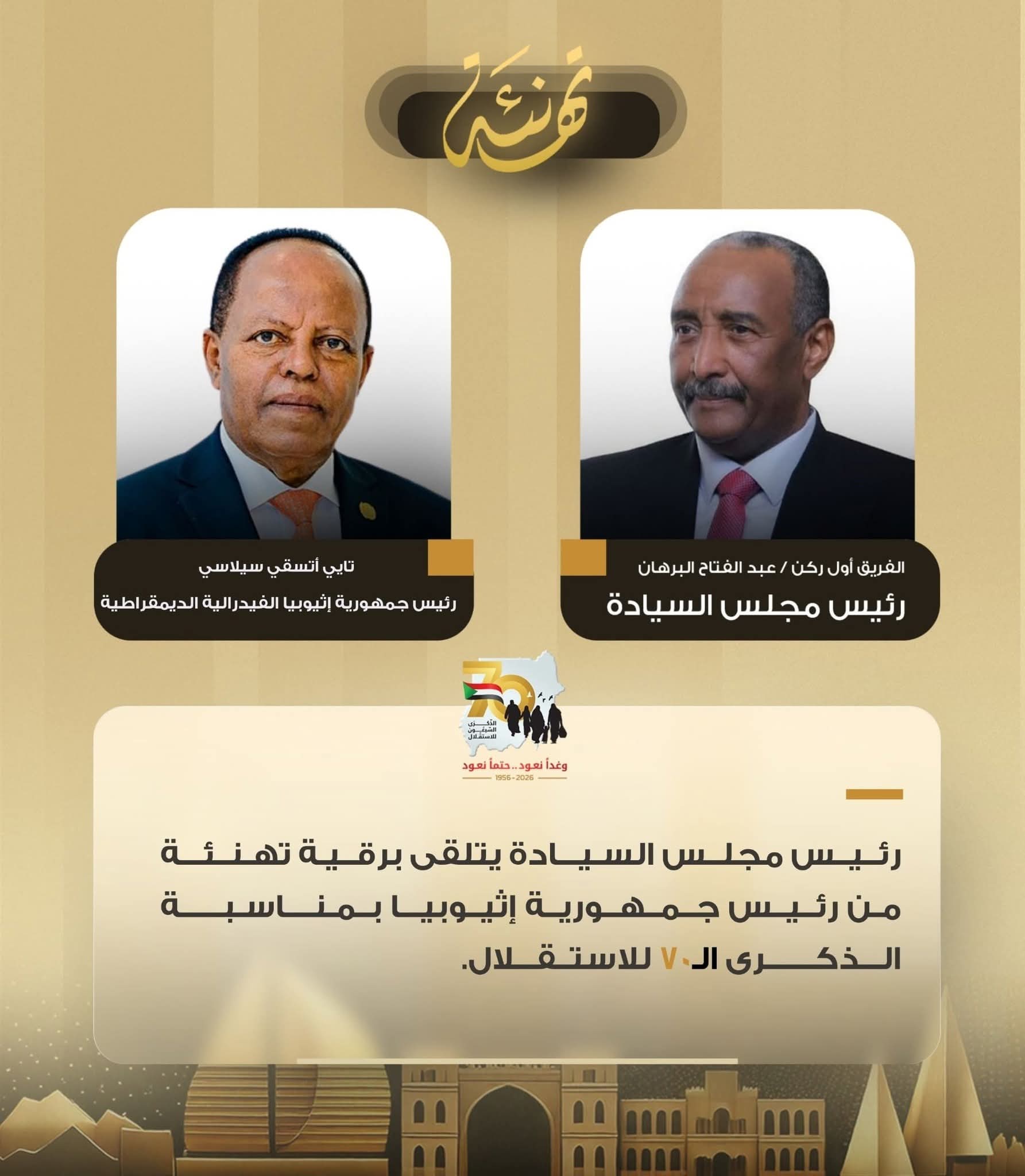 رئيس مجلس السيادة”عبدالفتاح البرهان”،يتلقى برقية تهنئة من رئيس جمهورية إثيوبيا الفيدرالية الديمقراطية،بمناسبة الذكرى الــ70 للاستقلال الأخبارمواضيع بارزة في يناير 22, 2026 شارك شارك FacebookTwitterGoogle+ReddItWhatsAppPinterestالبريد الإلكتروني