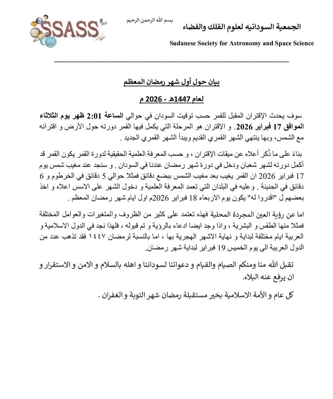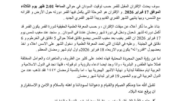 أصدرت الجمعية السودانية لعلوم الفلك والفضاء بيانا أوضحت فيه أن حدوث الاقتران المقبل للقمر سيتم حوالي الساعة 2:01 ظهر يوم الثلاثاء الموافق 17 فبراير 2026 م وهو المرحلة التي يكمل فيها القمر دورته حول الأرض فيكون القمر قد أكمل دورته لشهر شعبان ودخل في دورة شهر رمضان في السودان .